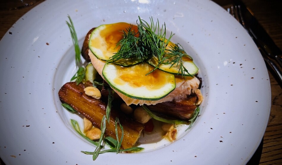 toppmurkla, ramslök, spetskål, svartkål, kålrabbi, parmesan. Eldad röding palsternacka, chili, hasselnötter, zucchini, brynt smör, soja-glaze.