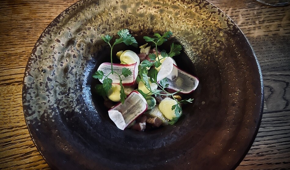 Typiska maträtter: Hängmörad ryggbiff. Persiljerot, picklad röd endiv, märg-crust, vattenkrasse. Lammrostbiff